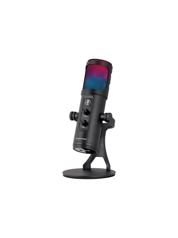 RGB streaming-mikrofon med USB-C-indgang, plug-and-play-opsætning, kardioid retningskarakteristik og indbyggede betjeninger til volumen og rumklang.DELTACO GAMING RGB streaming-mikrofon er designet til at løfte lydkvaliteten på dine game-streams med RGB-b